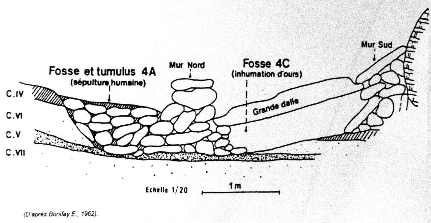“Many stones [including tools], bear bones and a deer antler were then stacked together to form a small mound above the grave, then a fireplace covered the entire grave,” leading Bonifay to conclude the intentionality of the construction and burial. Similarly to Drachenloch, the entombment was impressively flanked by “about twenty stone boxes which contained the bones of [brown] bears.” Observations made with the assistance of Bernard Vandsermeersch further confirm anthropogenic origin of the structure based on “arrangement of equipment, stone paving, internal formwork protecting a bear skull…[and] stones brought from the outside.”