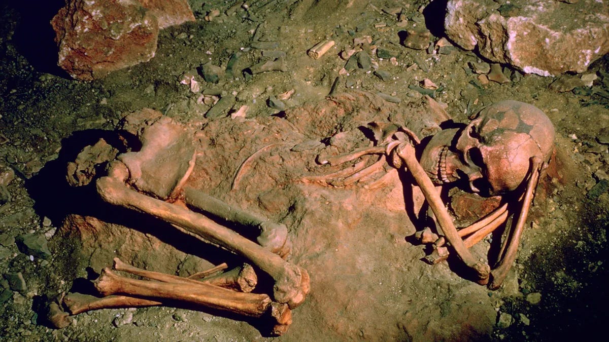 The color red, deeply tied to the symbolism of blood, connects the earthly body to the cosmic cycle of birth and rebirth. The application of red ochre in burials transforms these sites into spaces of ritualized renewal, tying the individual’s fate to the rhythms of the natural world. Together with the fetal positioning and solar alignments, ochre affirms the Neanderthal belief in life as a cycle—a sacred journey from one state of existence to the next.