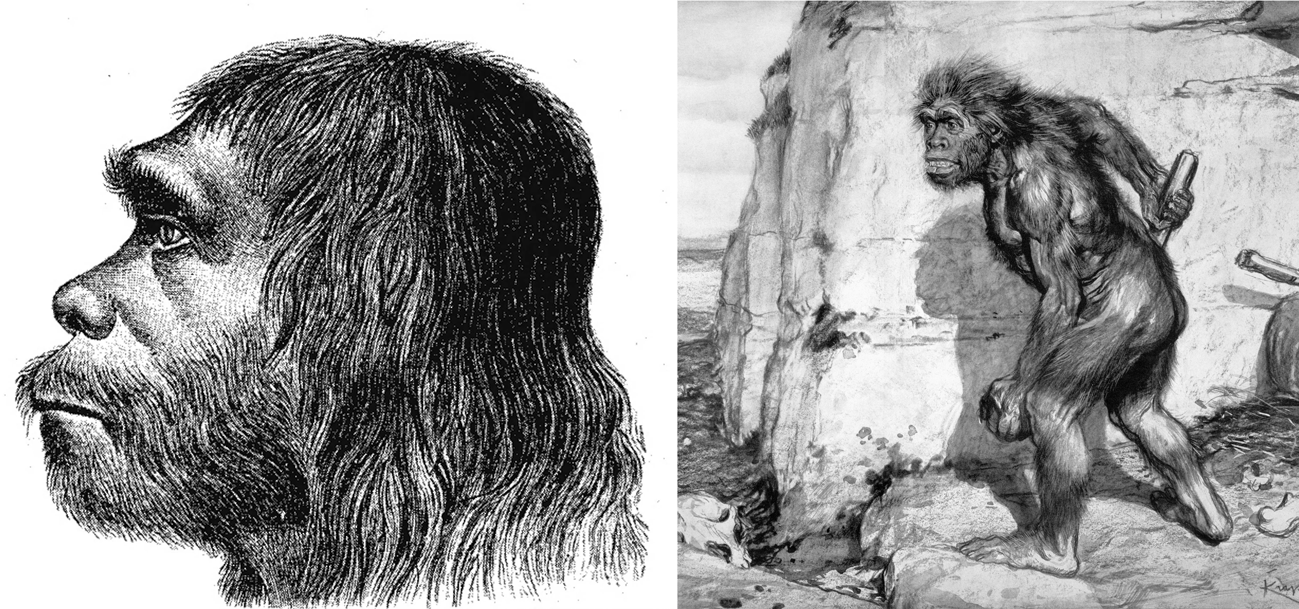Interestingly, this early framing did not remain stable. By 1888, Schaaffhausen’s own reconstruction reflected a shift. Produced decades after the initial discovery, and after Darwinian evolution had secured its intellectual dominance, his depiction is markedly more extreme: heavily muscled, covered in hair, and visually distanced from modern man. The same thinker who once argued for an ancient humanity, however wild, now appears to accommodate a more ape-like interpretation.