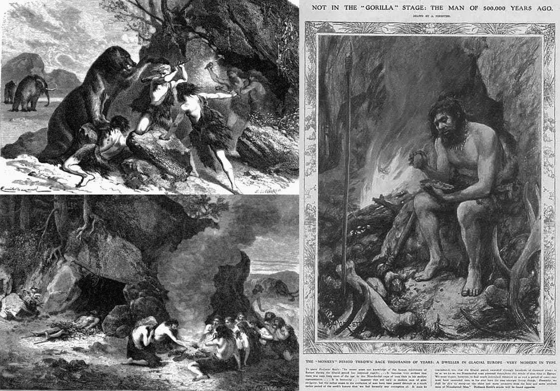 Interestingly, this was not the only way Neanderthals were imagined. Nearly two decades earlier, in 1870, Louis Figuier’s Primitive Man offered a very different vision. The book’s engravings by Emile-Antoine Bayard depict prehistoric humans as recognizably European figures: lean, long-haired, clothed in animal skins, but fundamentally human in posture and expression. Though later dismissed as romantic or anatomically imprecise, these images preserve a fundamentally human conception of the Neanderthal rather than the increasingly popular “missing link” model.